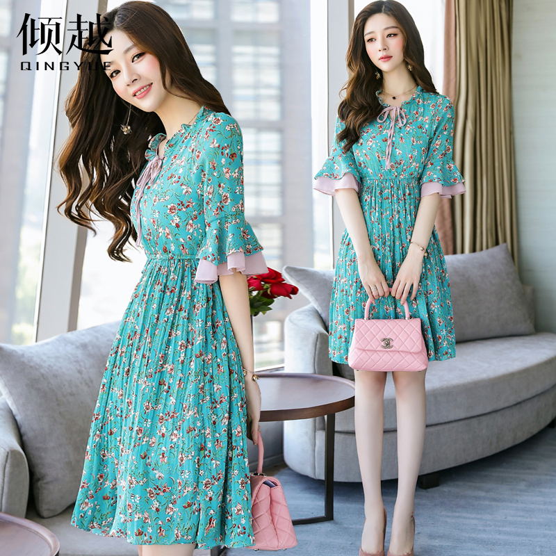 氣質淑女碎花百褶雪紡連衣裙..