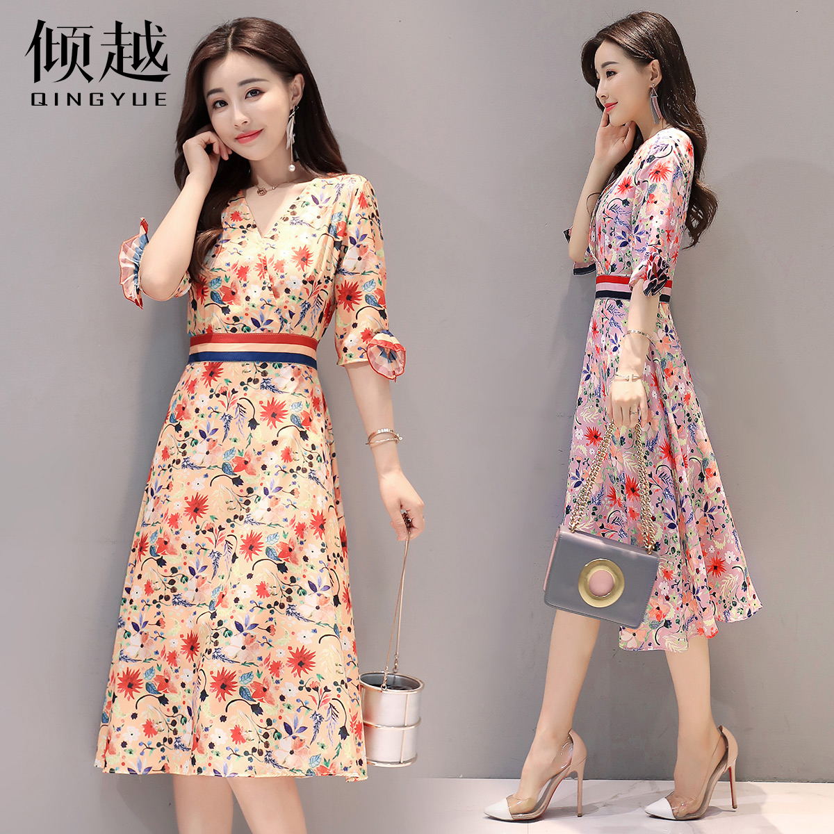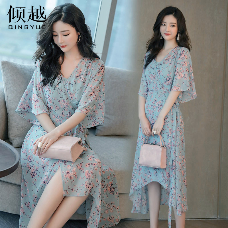 夏季淑女V領碎花雪紡連衣裙..
