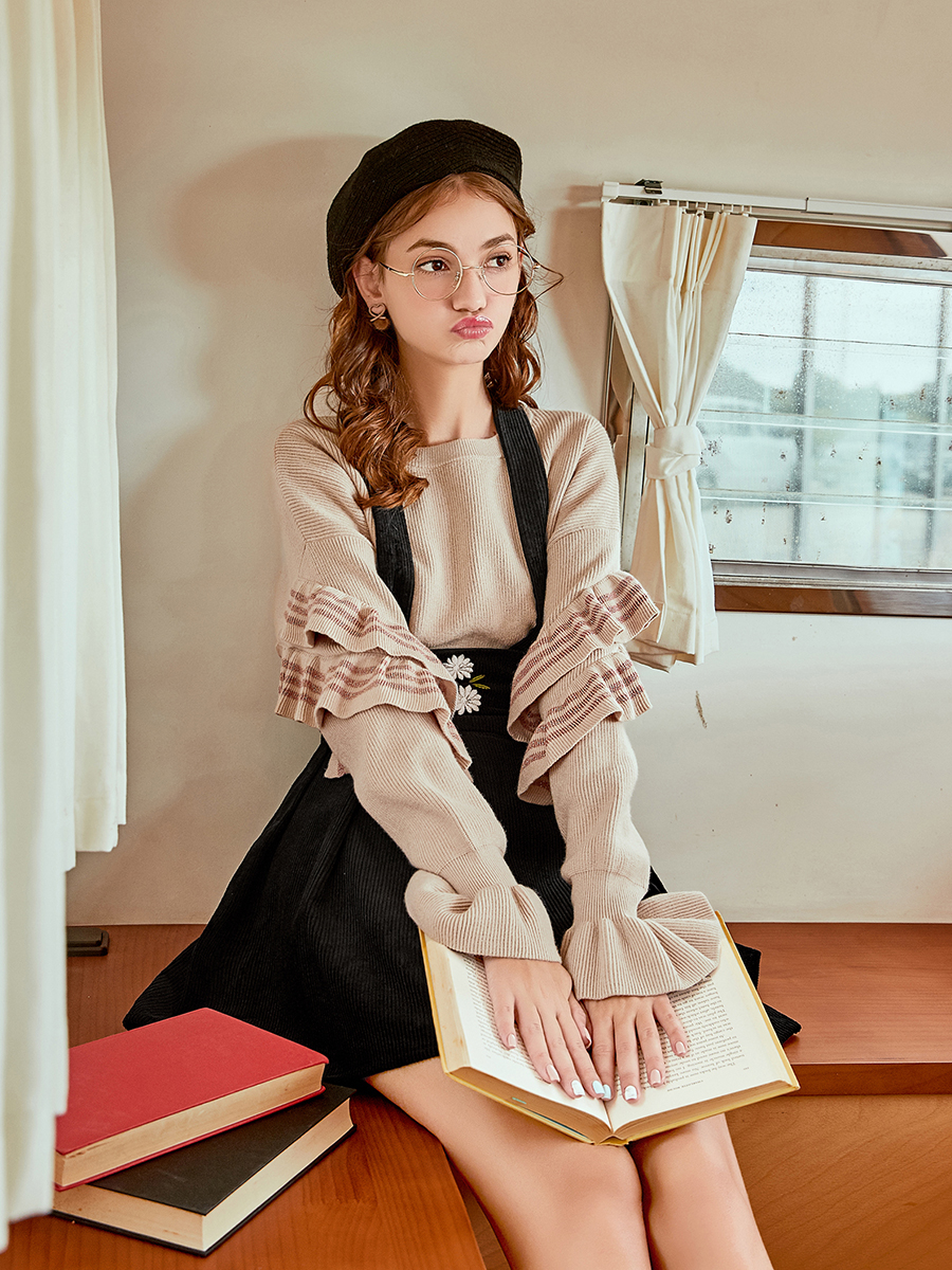 MG小象木耳邊針織衫女套頭秋冬新款休閑時尚寬松毛衣復古chic上衣