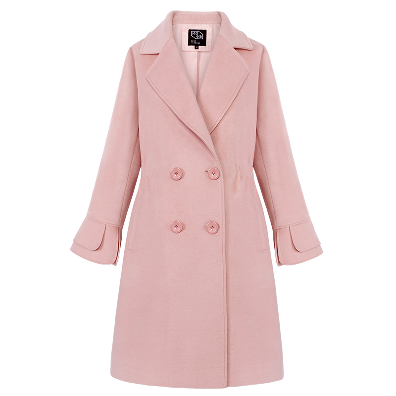 MG小象雙排扣毛呢外套女中長款過膝2018新款寬松收腰粉色呢大衣潮