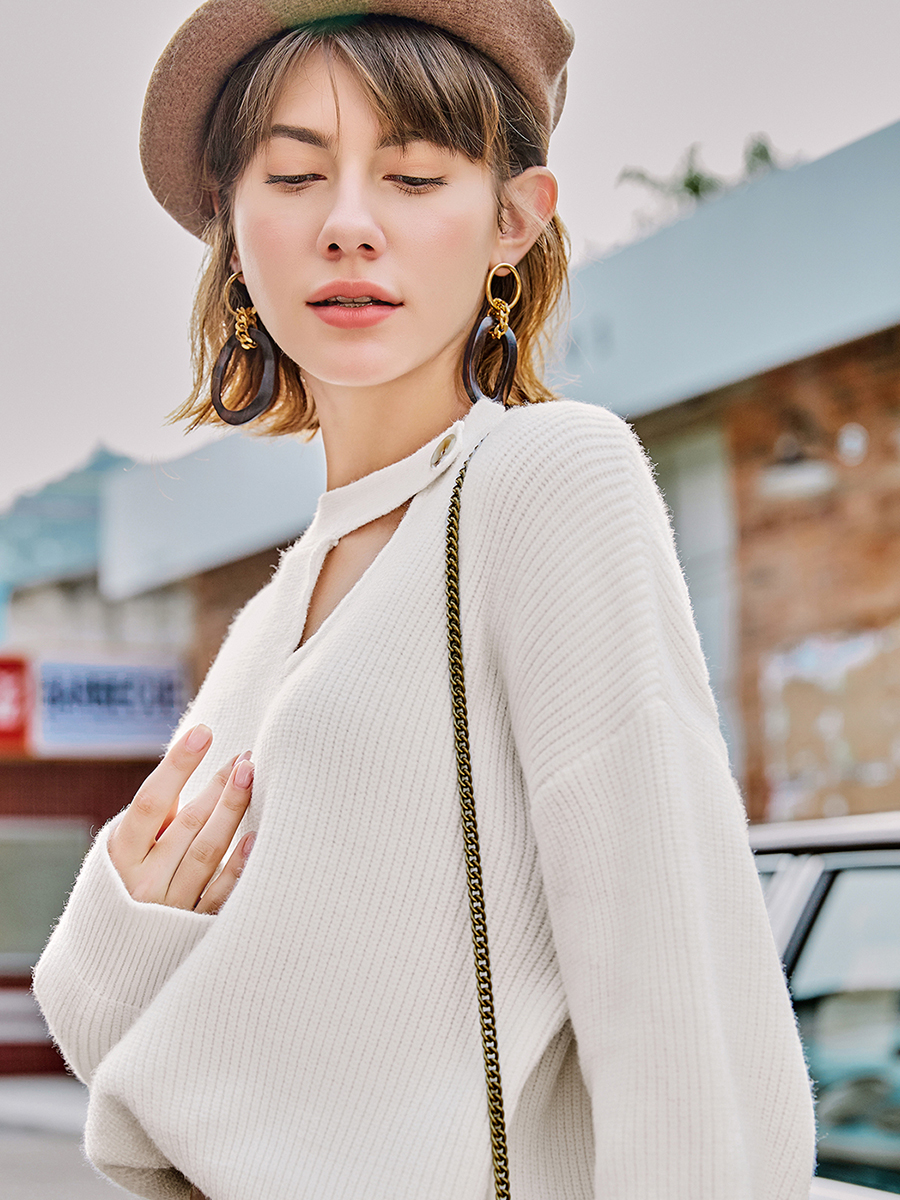/ MG小象套頭白色毛針織衫女性感長袖秋冬2018新款心機寬松chic上衣
