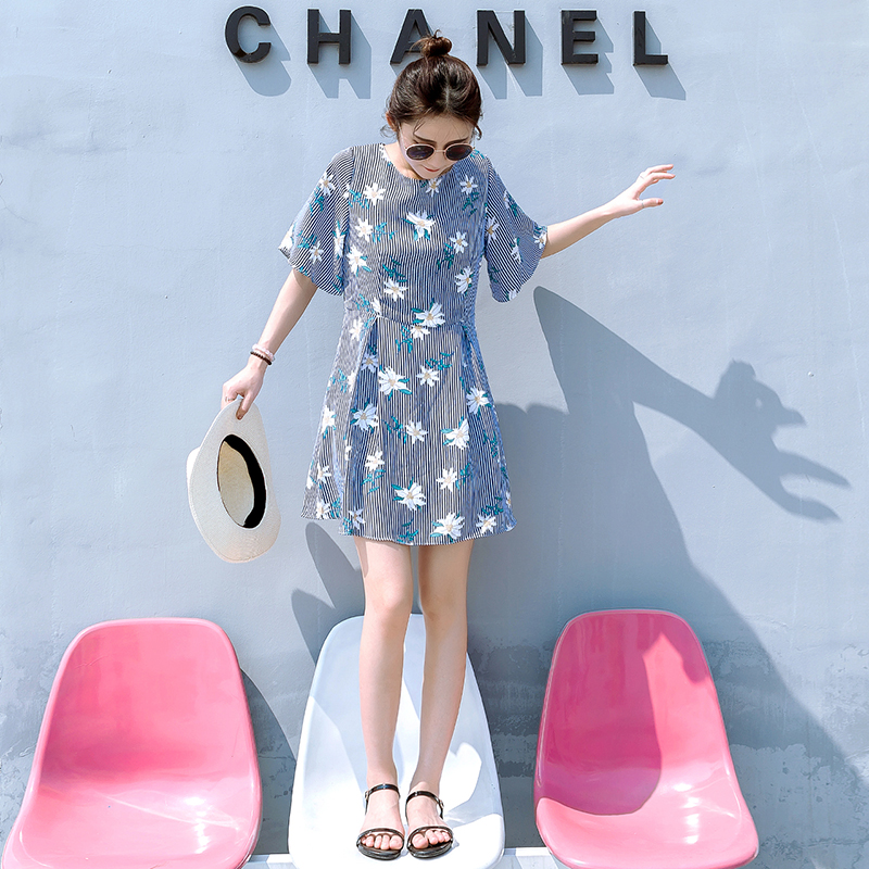 夏季新款韓版女裝雪紡印花連衣裙小清新學生中長款短袖裙子潮