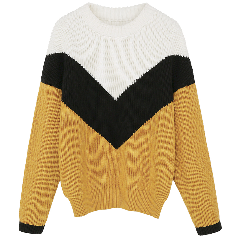 MG小象慵懶風套頭毛衣女撞色圓領針織衫冬季新款寬松長袖加厚上衣