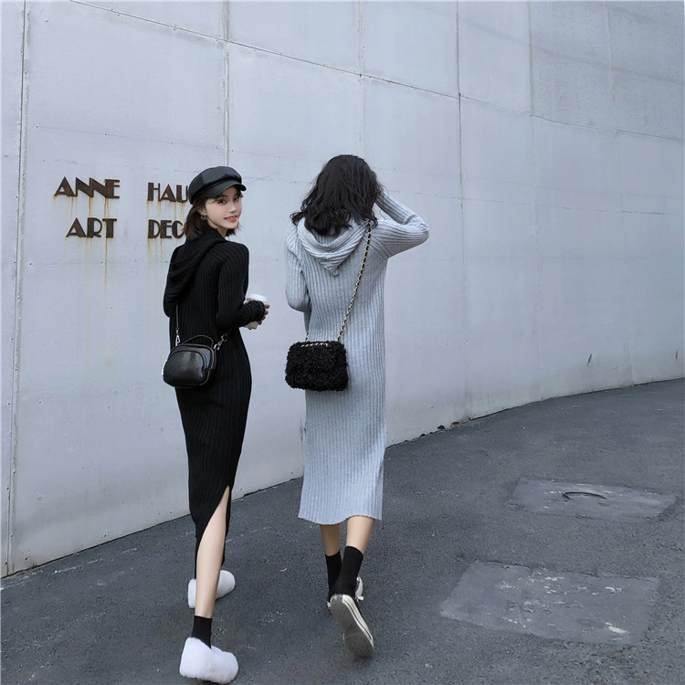 秋冬新款時尚chic百搭裙子連帽長款過膝毛衣裙長袖針織連衣裙女潮