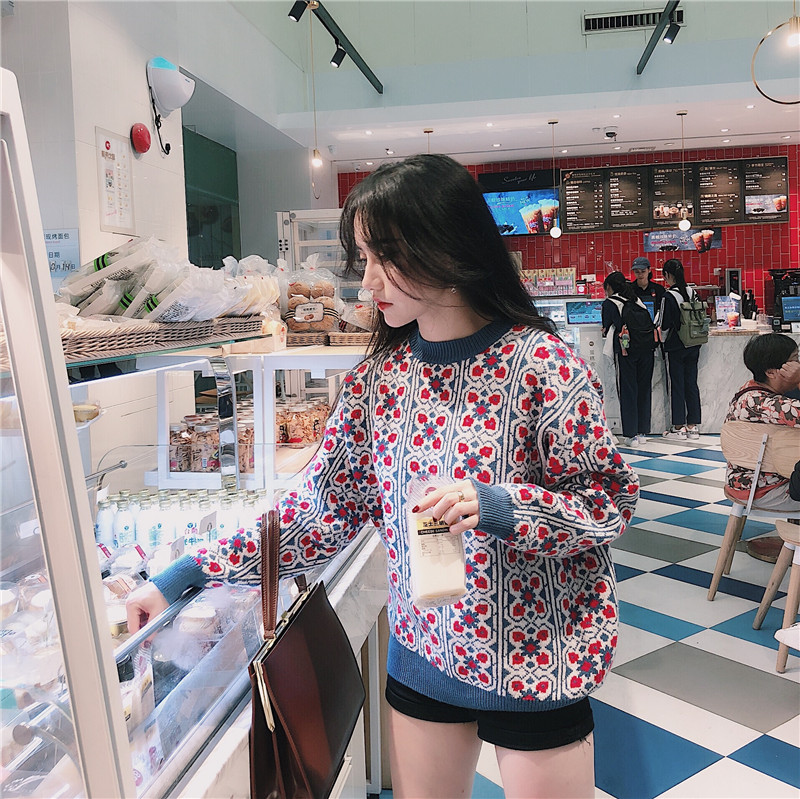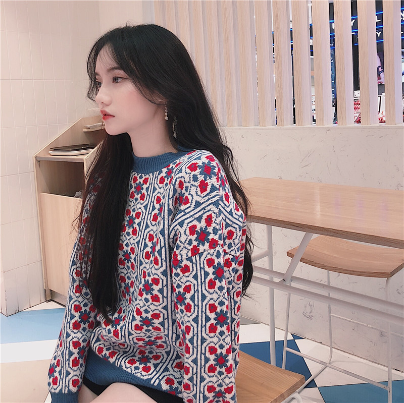 2018秋冬新款時尚chic溫柔風花花毛衣女套頭寬松懶惰圓領毛線衣女