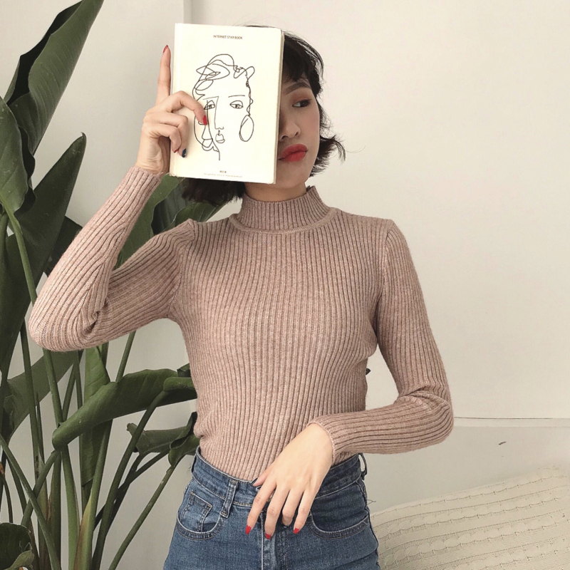 / 純色中高領加厚坑條打底針織衫內搭保暖毛衣