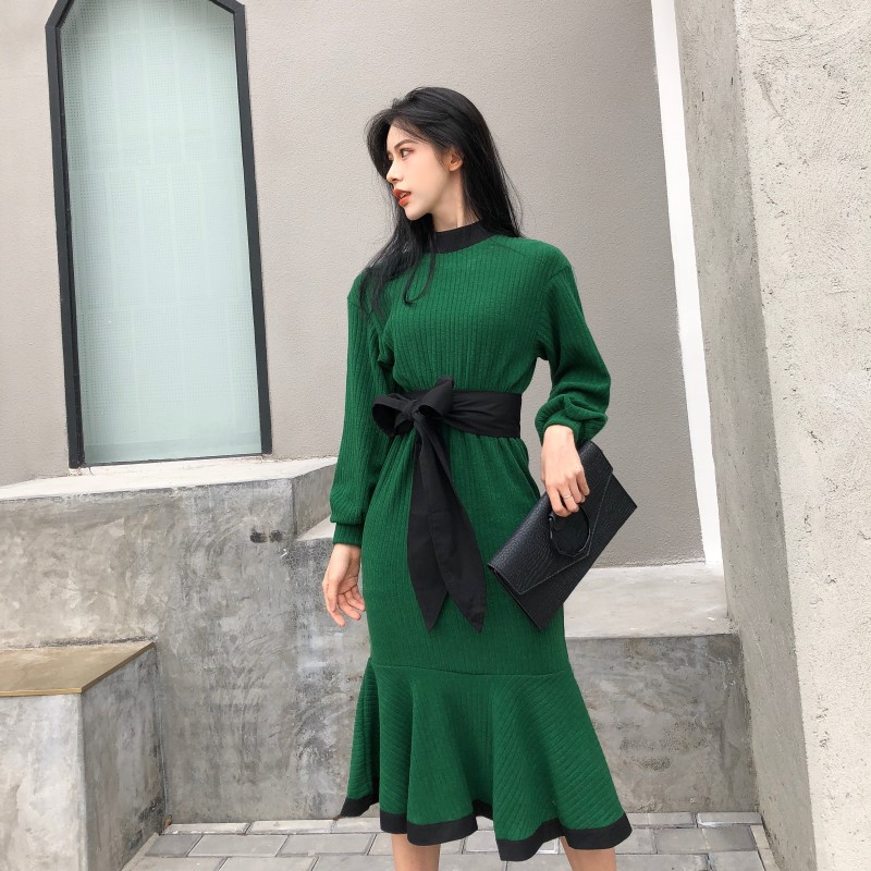 / 晚晚風新款韓版女時尚氣質百搭顯瘦中長款打底魚尾裙連衣裙配腰帶