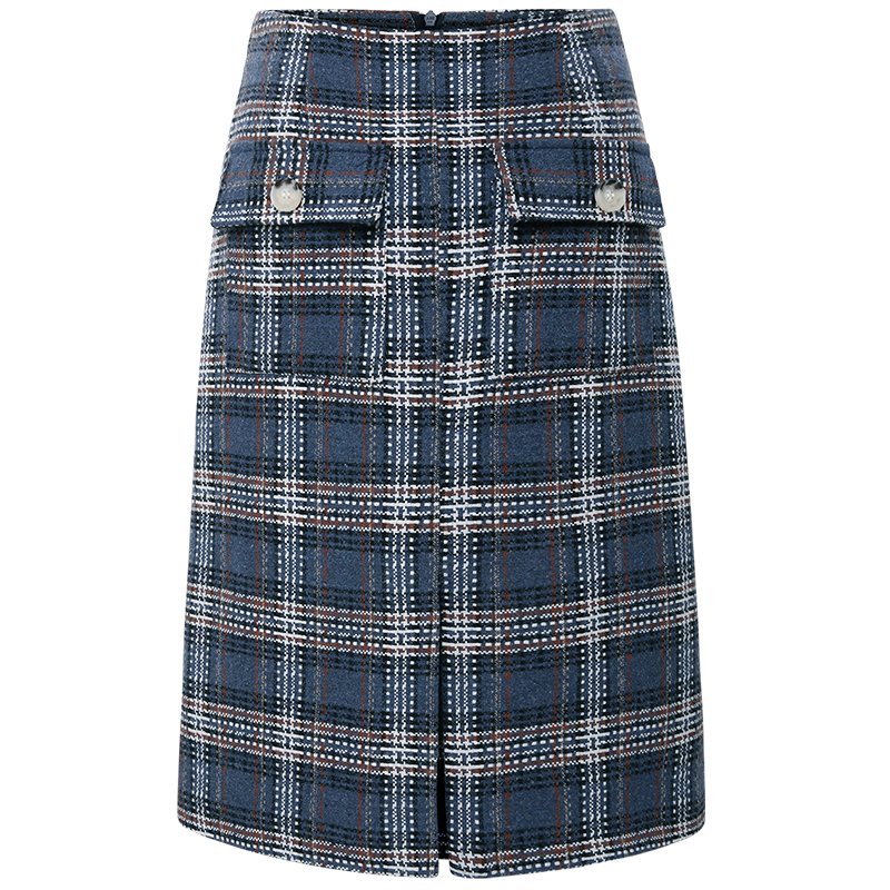 MG小象高腰格子半身裙女中長款秋冬2018新款港味復古開叉a字裙子