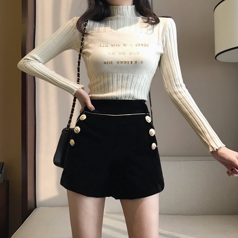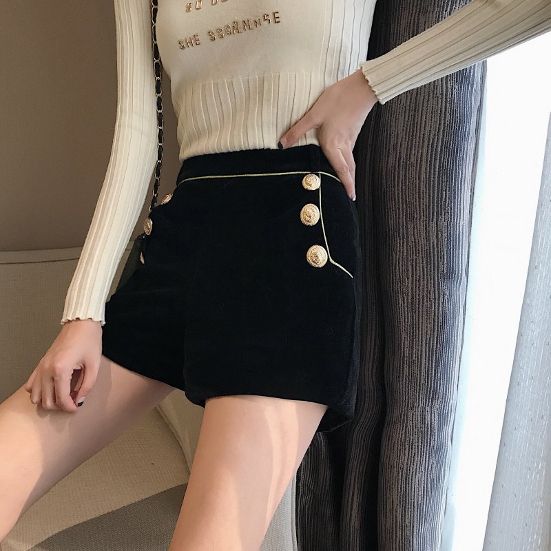 / 褲子女新款秋冬韓版百搭時尚絲絨chic雙排扣短褲A字闊腳褲靴褲潮