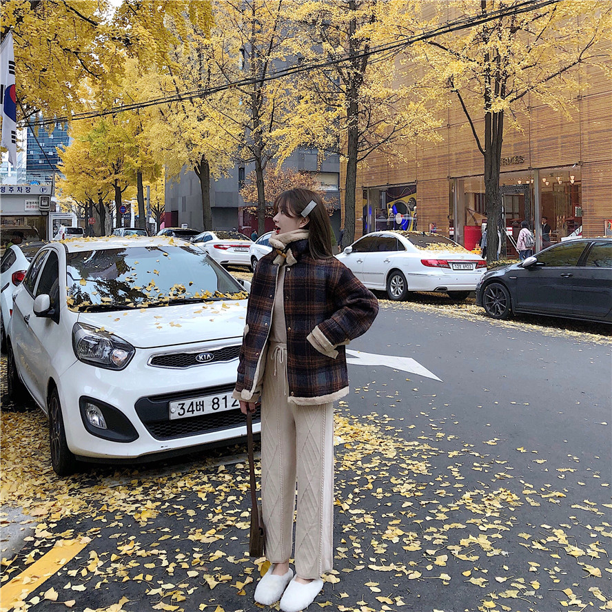 高領打底+復古加絨毛呢格子+系帶麻花針織褲套裝